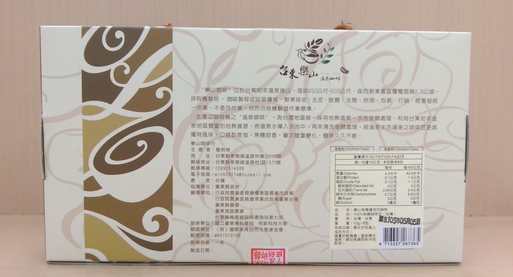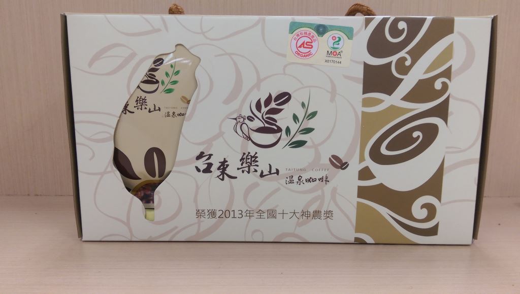 樂山咖啡位於台東知本溫泉後山,海拔450~600公尺,座西朝東園區種植面積3.5公頃,採有機栽培,咖啡製程從幼苗種植、鮮果採收、去皮、發酵、去殼、烘培、包裝、行銷、販售皆統一作業,不委外作業,均符合有機驗證作業標準。