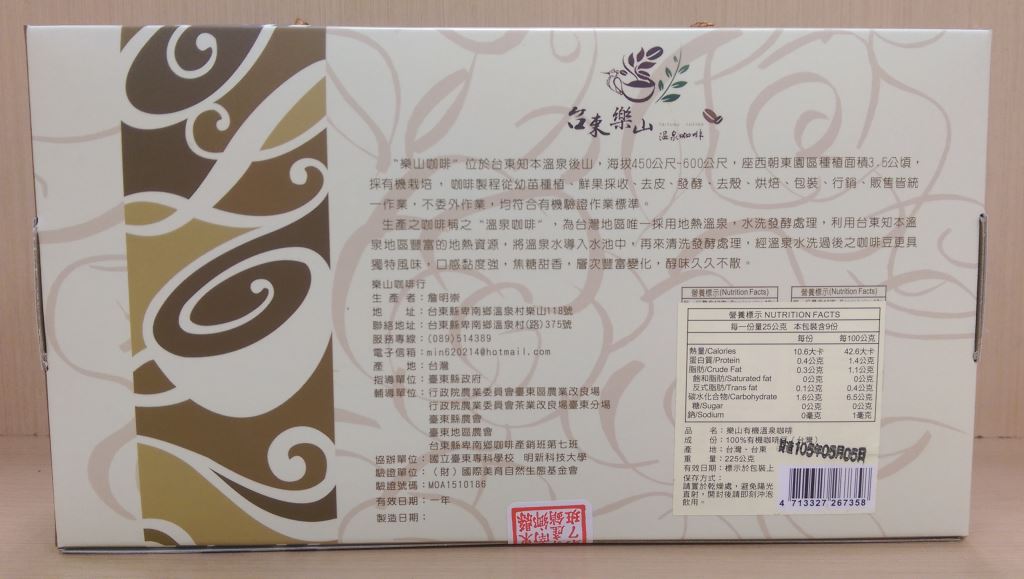 樂山咖啡位於台東知本溫泉後山,海拔450~600公尺,座西朝東園區種植面積3.5公頃,採有機栽培,咖啡製程從幼苗種植、鮮果採收、去皮、發酵、去殼、烘培、包裝、行銷、販售皆統一作業,不委外作業,均符合有機驗證作業標準。