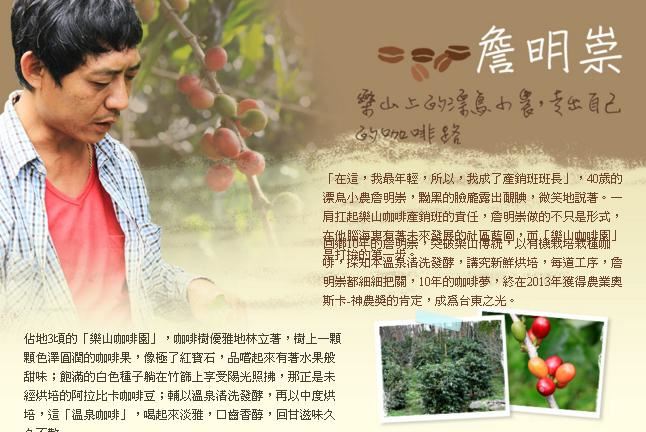 回鄉10年的詹明崇,突破樂山傳統,以有機栽培栽種咖啡,採知本溫泉清洗發酵,講究親鮮烘培,每道工序,詹明崇都細細把關,10年的咖啡夢,終在2013年獲得農業奧斯卡-神農獎的肯定,成為台東之光。