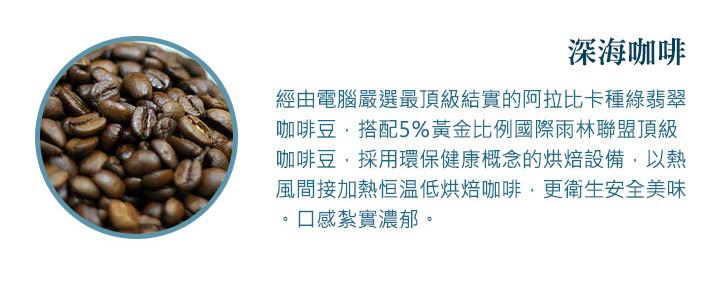 使台灣深海咖啡口感更紮實濃郁。臺東山豬園深海咖啡不同於傳統直火式烘焙及水洗或半水洗醱酵咖啡的製作方式,係採用臺東縣政府與財團法人石材暨資源產業研究發展中心輔導創新研發,以深層海水負離子造霧醱酵咖啡技術,經由電腦嚴選最頂級結實的阿拉比卡種綠翡翠咖啡豆,採用環保健康概念的烘焙設備,以熱風間接加熱恒温低烘焙咖啡,更衛生安全美味。