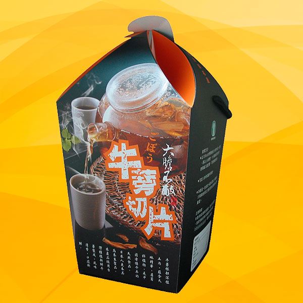 1.以1200cc水煮開後倒入牛蒡片約一台兩,再以小火慢煮,十分鐘後即可飲用,時間越久越甘醇,可做保健茶飲,上班族直接以開水沖泡亦可。