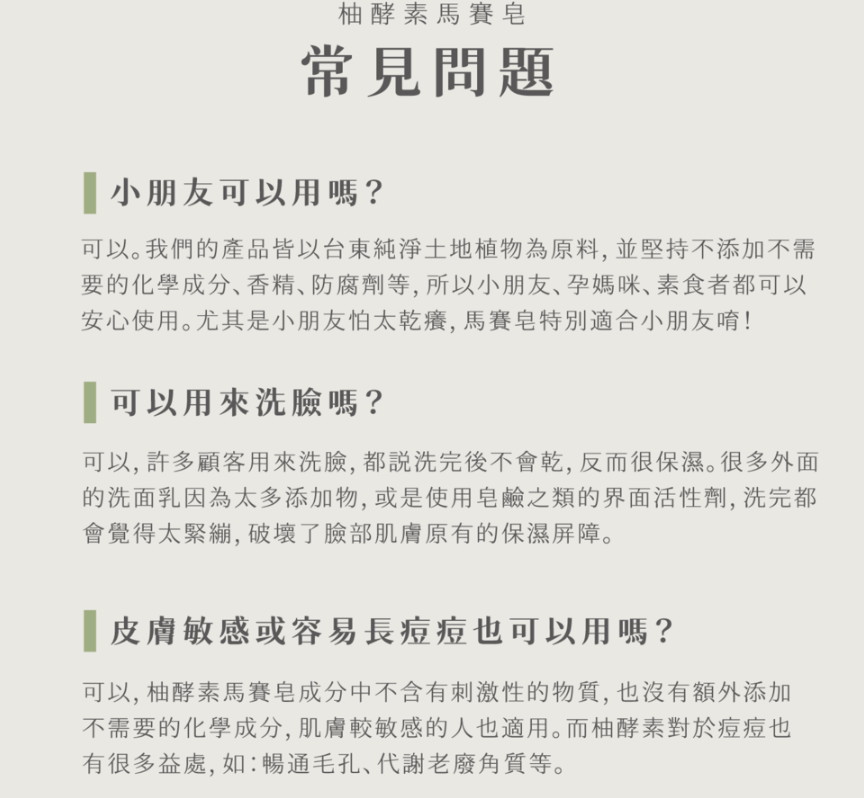 成份:柚子酵素、橄欖油72%、椰子油20%、 紅棕櫚油8%、純水、NaOH