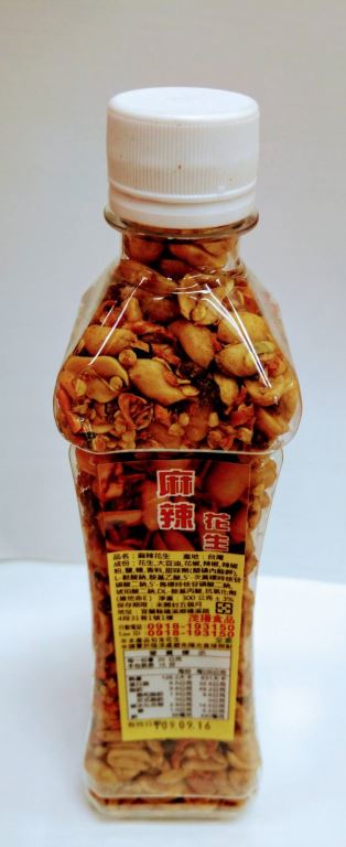 成份:花生、大豆油、花椒、辣椒、辣椒粉、鹽、糖、香料、甜味劑(醋磺內酯鉀)、L-麩酸鈉、胺基乙酸、5'-次黃嘌呤核苷磷酸二鈉、5'-鳥嘌呤核苷磷酸二鈉、DL-胺基丙酸、抗氧化劑(維他命E)