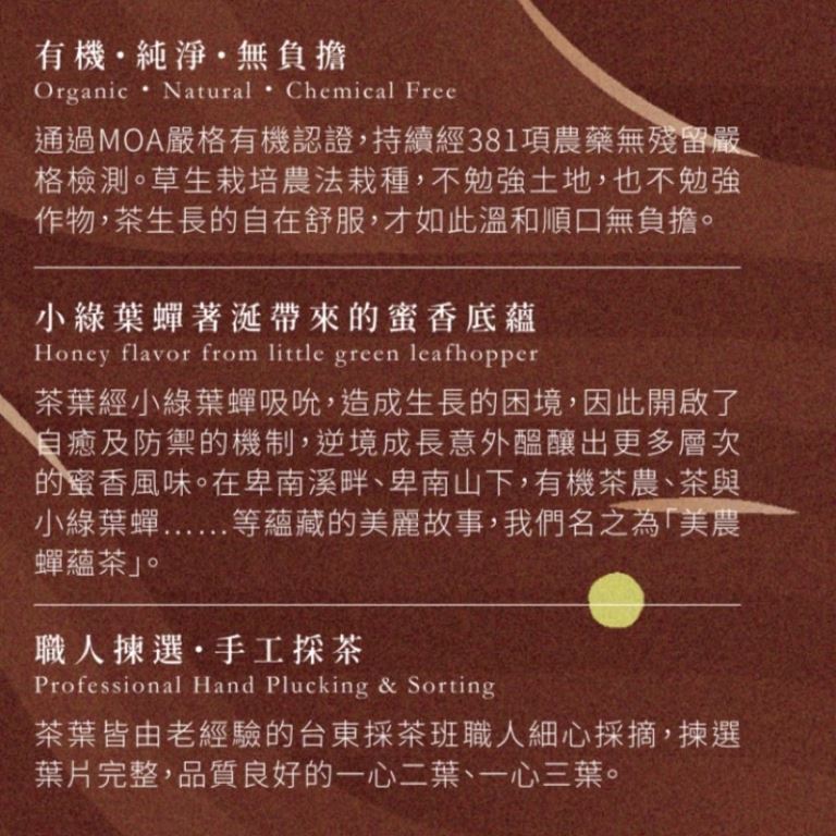 經小綠葉蟬吸食,植物的自癒及防禦機制便會開啟,增加葉片的「茶多元酚類」及「茶單寧」── 用來吸引小綠葉蟬的天敵「白斑獵蛛」來幫忙帶走小綠葉蟬,因此也使得茶的蜜香更加濃郁。由於小綠葉蟬需要無農藥的健康生存環境,因此在品嚐蜜香甜蜜滋味時,也能確保入口的是完全無毒無農藥,貨真價實的極品好茶。