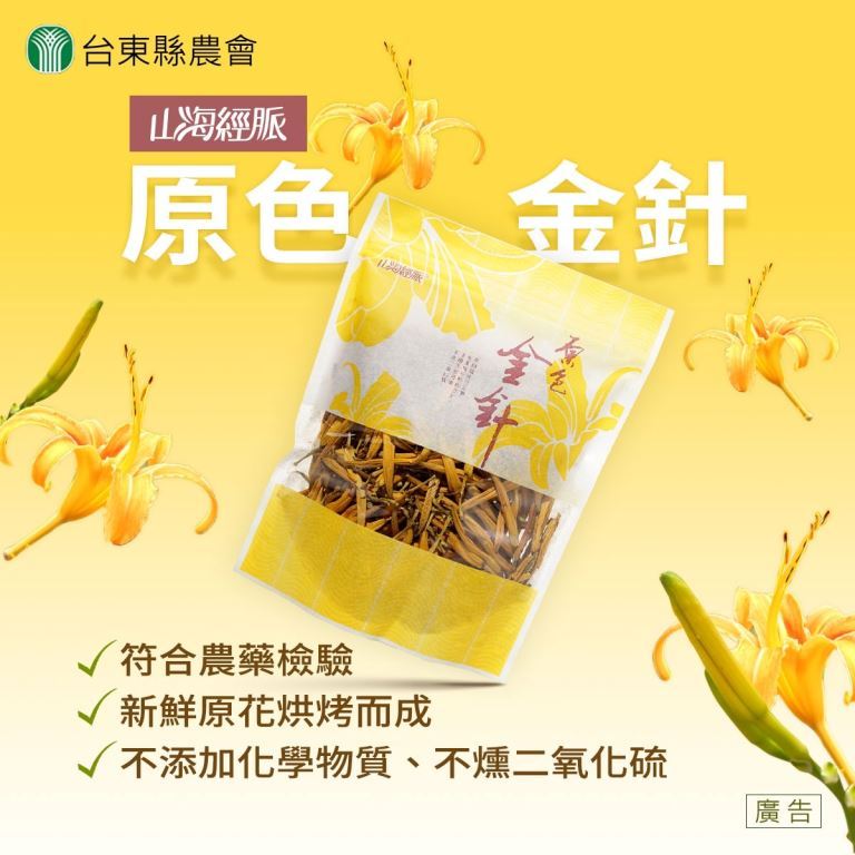 來自陽光充足的花東縱谷,完全不含二氧化硫的安全金針,雖然沒有傳統加工金針艷麗的外表,但卻有獨特的金針香味與清甜,只需清洗乾淨,不用浸泡,烹調超簡便。
