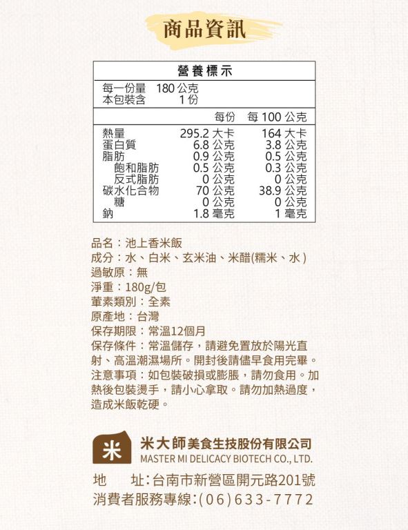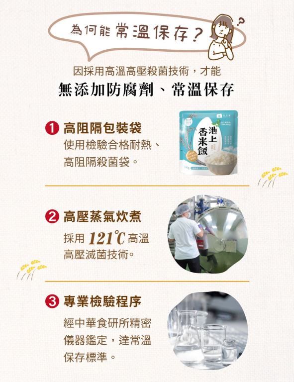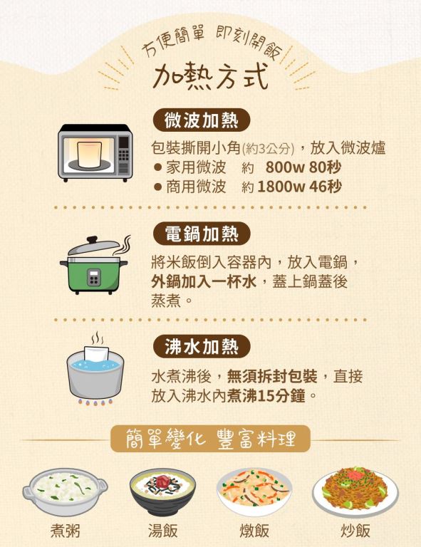 注意事項:如包裝破損或膨脹,請勿食用。加熱後包裝燙手,請小心拿取。請勿加熱過度造成米飯乾硬。