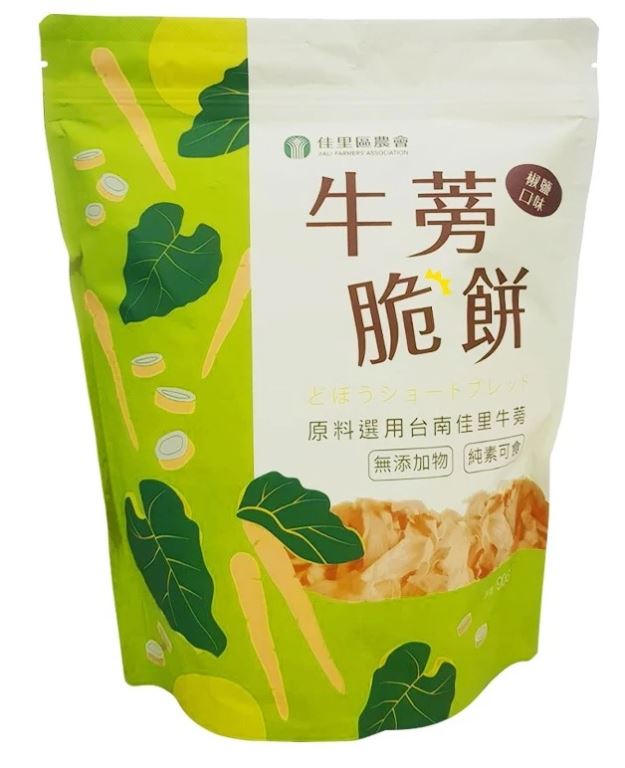 原料採用台灣本土牛蒡,在地嚴選,以低溫油炸,再經高速抽油、脫油等程序,讓這款牛蒡脆餅吃起來相當爽口,別具風味,重點是可以吃到牛蒡本身的香氣,牛蒡富有膳食纖維及多種的營養素,零食界的新寵,不吃不可啊!