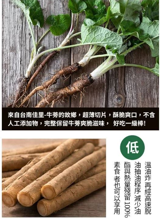 原料採用台灣本土牛蒡,在地嚴選,以低溫油炸,再經高速抽油、脫油等程序,讓這款牛蒡脆餅吃起來相當爽口,別具風味,重點是可以吃到牛蒡本身的香氣,牛蒡富有膳食纖維及多種的營養素,零食界的新寵,不吃不可啊!