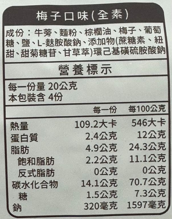 成份:牛蒡、麵粉、棕櫚油、梅子、葡萄糖、鹽、L-麩胺酸鈉、添加物(蔗糖素、紐甜、甜菊糖苷、甘草萃)環己基磺硫胺酸鈉