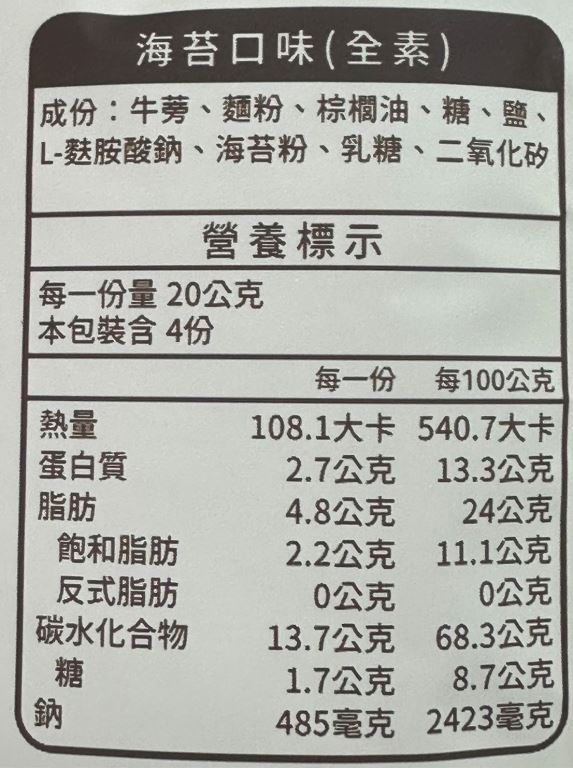 成份:牛蒡、麵粉、棕櫚油、糖、鹽、L-麩胺酸鈉、海苔粉、乳糖、二氧化矽