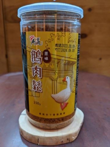 成份:新鮮鵝肉、豬肉(台灣)、糖、食鹽、L-麩酸鈉、豌豆粉、棕櫚油、醬油
