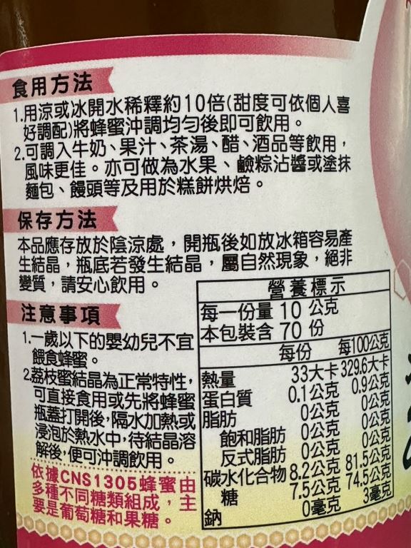 注意事項:本產品為天然蜂蜜,過敏者請斟酌食用,一歲以下嬰幼兒不宜餵食蜂蜜。