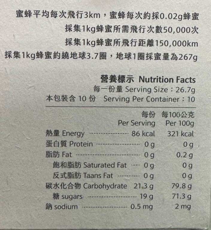 蜜蜂採蜜平均每次飛行約 3km,採回約 0.02g 蜂蜜;地球周長 40,075km ,換算蜜蜂繞行地球一圈可採回約 267g 蜂蜜。