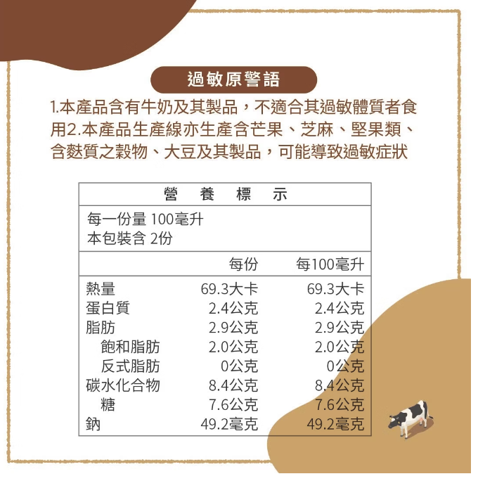 成份:乳含量50%以上,乳蛋白質含量1.5%以上。