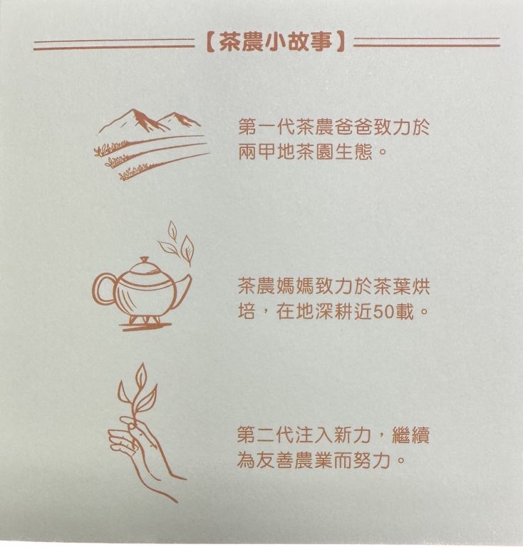 近後期發展出的在地台東地方特色茶,重發酵重烘培,紅烏龍茶的茶湯明亮呈現透徹的琥珀色,茶湯濃郁散發出幽幽的熟果香,入喉後回甘的滋味冷熱泡皆宜!