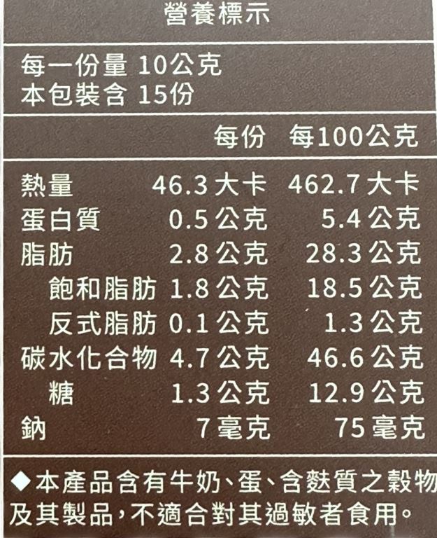 注意事項:本產品含有牛奶、蛋、含麩質之穀物及其製品,不適合對其過敏者食用。