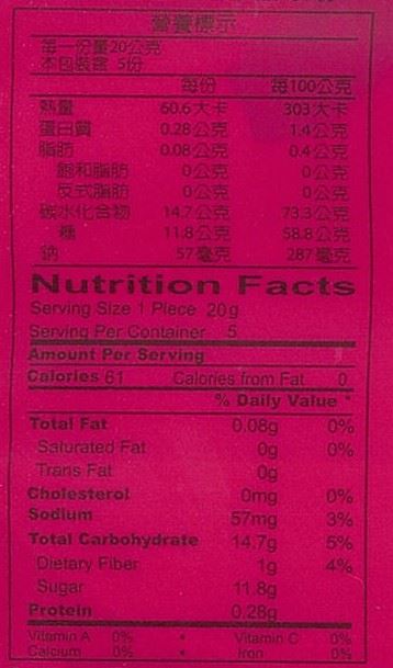 食品添加物:檸檬酸、食用色素黃色5號、甘草萃(甜味劑)、辣椒精、苯甲酸(防腐劑)、偏亞硫酸氫鈉、食用色素紅色40號