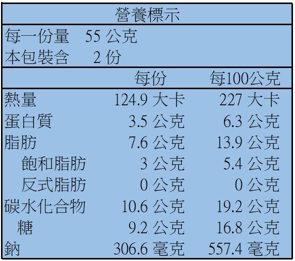 成分: 樹薯澱粉、魚漿、糖、食鹽、棕櫚油、醬油、調味劑(L-麩酸鈉、胺基乙酸、DL-胺基丙酸、琥珀酸二鈉)、辣椒粉、食醋(水、釀造酢、糖、鹽、洋蔥、濃縮柳橙汁、胡蘿蔔汁、番茄糊、大茴、小茴、芹菜籽)