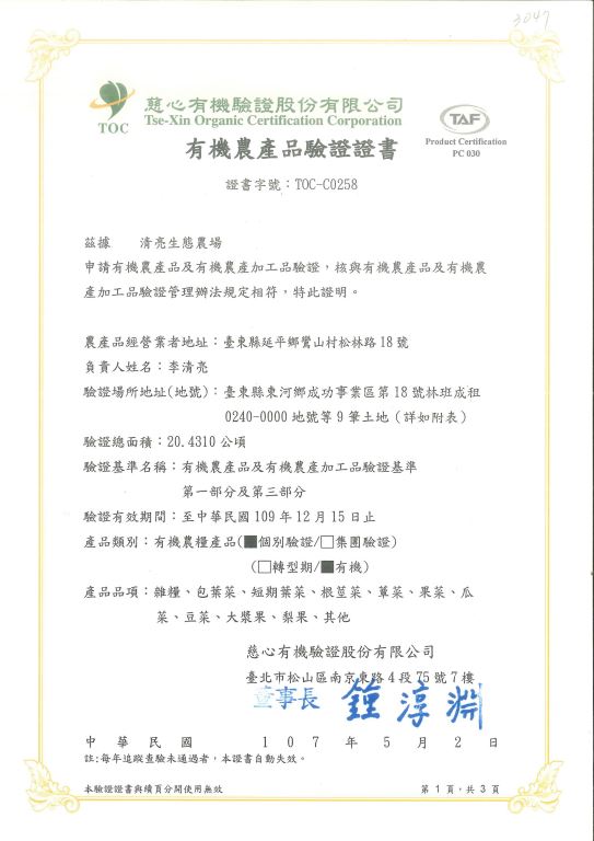 李清亮先生自小便學習務農,在六○年代時,因當時社會風氣影響,曾轉行進入工業領域。然而,在民國83年某一次偶然的機會下,體認到現代人的飲食健康受到化合農藥及肥料的侵蝕太過嚴重,而決定重拾過去務農的生活,以尊重大自然,不使用化學肥料和農藥以健康的方式來栽種有機蔬果,並於民國96年取得【慈心有機農業發展基會-有機證書】,希望能提供最健康的食品給社會大眾。